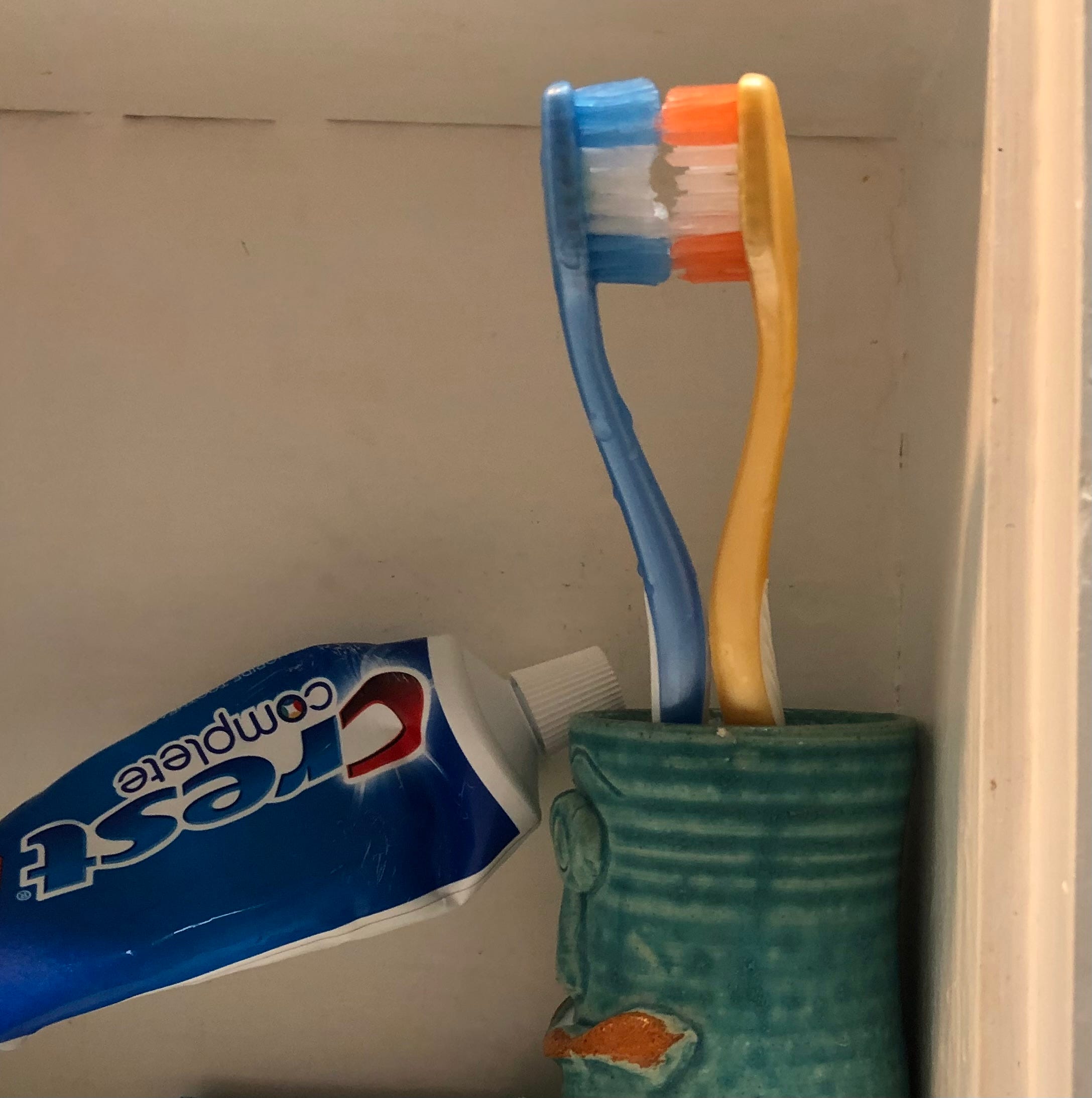 The other night, when Alix and I were getting ready for bed, I noticed that our toothbrushes were embracing. So I took this picture. It looked like they’d had a long day. You would, too, if you sat in a dark medicine cabinet most of the time, except for when you got yanked out of your holder and scrubbed across a set of grungy teeth. It can’t be fun to be a toothbrush. But it might be rewarding to be part of a pair. When you’re wet and grungy and ragged, it means everything to have someone who will let you lean on them for a little while.